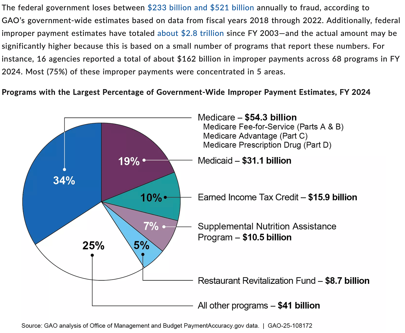 The scale of the problem is staggering. According to the U.S. Government Accountability Office (GAO), the federal government loses between $233 billion and $521 billion annually to fraud. In fiscal year 2024 alone, agencies identified $162 billion in “improper payments.” These are payments that should not have been made at all or were made in the incorrect amount.